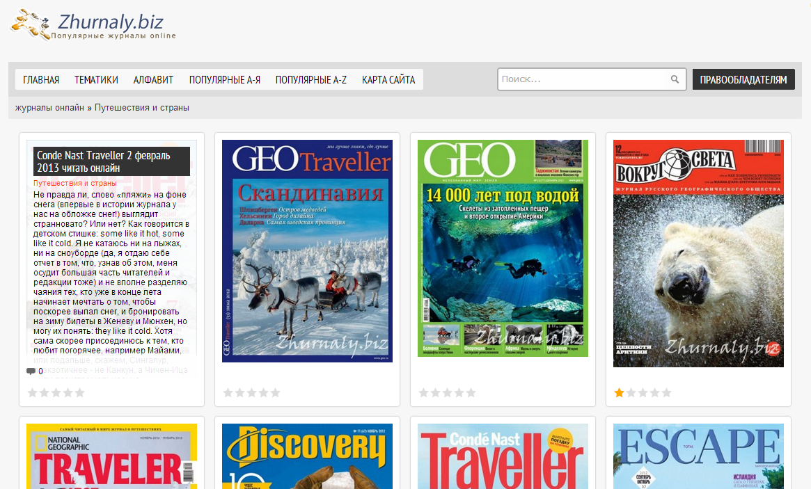 zhurnaly.biz использует ссылки на http://issuu.com, выбирая лишь русскоязычную продукцию, а также предлагая просмотр без регистрации.