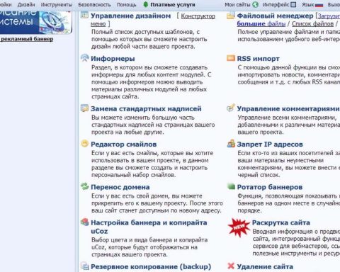 - При переезде на uCoz адрес сайта останется прежним, контент сохранится. Возможны лишь небольшие изменения в некоторых элементах сайта из-за технических различий платформ. Вместе с тем, у Вас появятся новые возможности для развития своего ресурса. uCoz предоставит Вам свой Конструктор сайтов с современными шаблонами и модулями для создания веб-страниц. Доступ к сайту по протоколу FTP тоже сохранится.