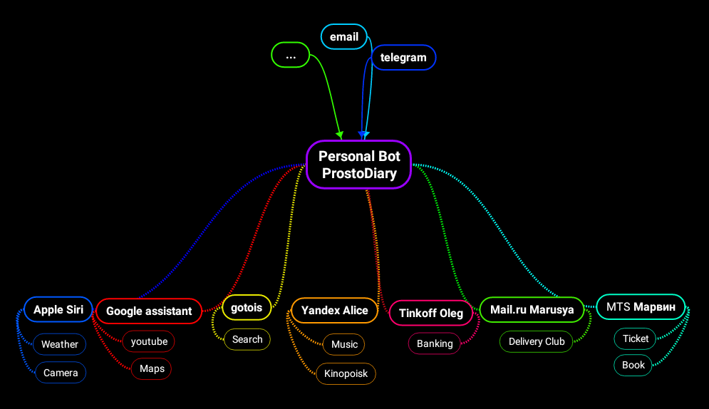 При этом, пользователь уже тратит уйму времен на освоение каждого ассистента, отдельно оплачивая каждый сервис и передавая каждому свои данные. Чтобы упростить и обезопасить этот процесс, требуется отказаться от прямого доступа пользователя к ассистентам и создать виртуального прокси бота, анализирующего входящие и исходящие сообщения и выполняющий в соответствии с портретом своего пользователя действия.