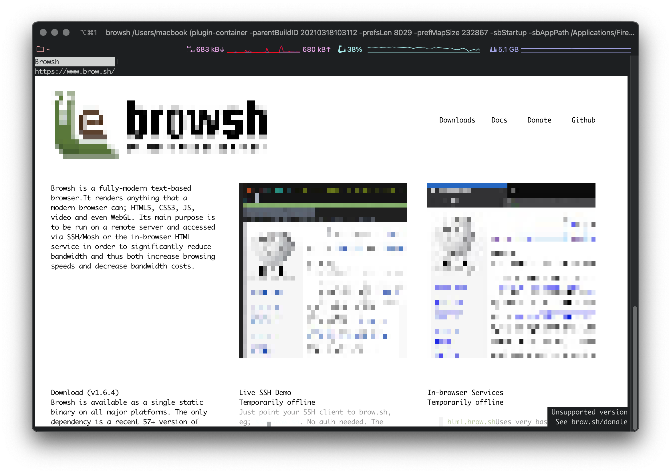 Всех этих недостатков лишён новый текстовый браузер Browsh. Его код написан на Go, а благодаря невидимому общению с Firefox по сокету, на нем можно выводить современный контент, который в итоге транслируется в ASCII графику. Такой сценарий идеально вписывается для работы в SSH на удаленной машине, экономя трафик и концентрируя внимание веб-серфера на контенте.